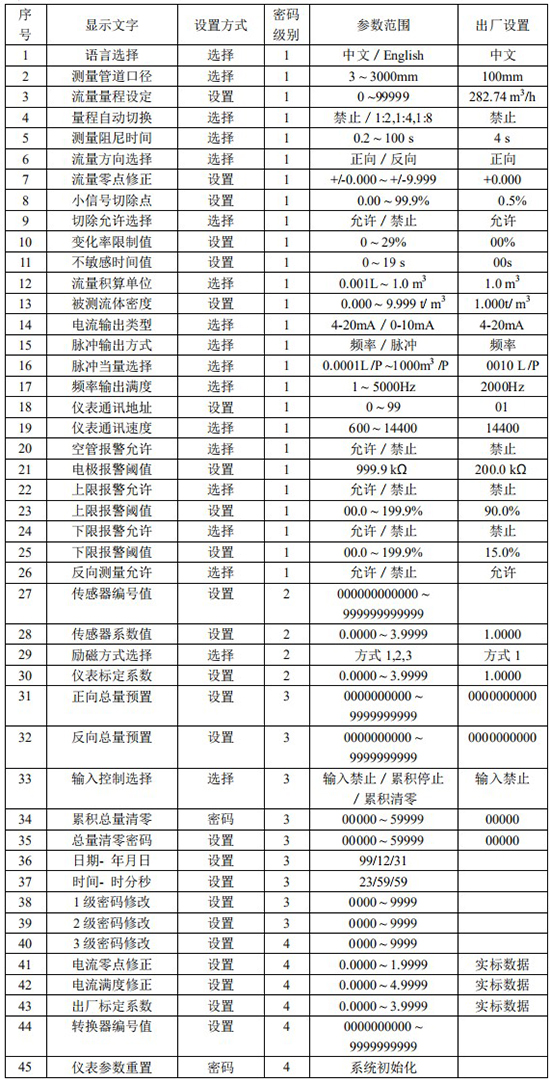 LDG 共有 45 個菜單項,使用管道水流量計時,用戶應根據(jù)具體情況設置或選擇各參數(shù)。LDG 菜單一覽表如下: