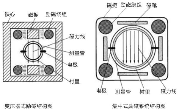 勵磁系統(tǒng)由勵磁線圈、高磁導率鐵心、磁扼組成。按測量管徑的大小可分為以下幾種結構。